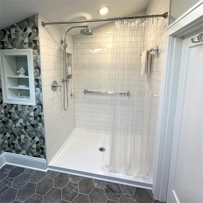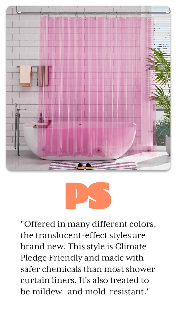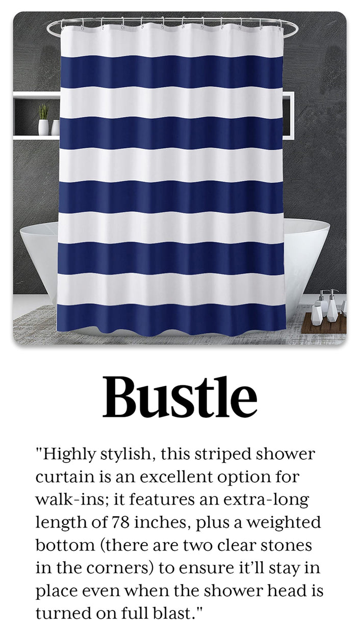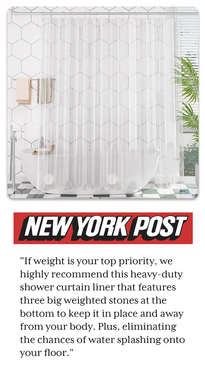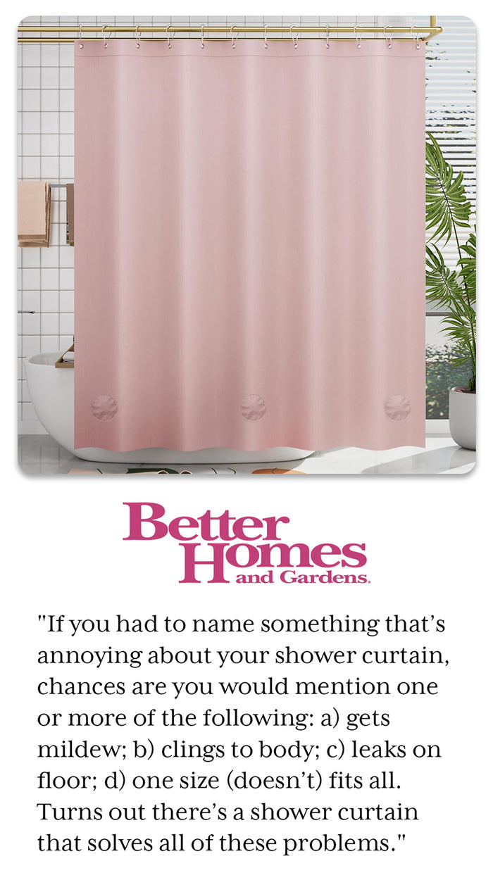 It’s thick and the weighted bottom keeps it in place even while showering. It doesn’t suck in towards you like some curtains. It’s nice to be able to fully open the space for cleaning and dog baths which we couldn’t do with a glass enclosure.